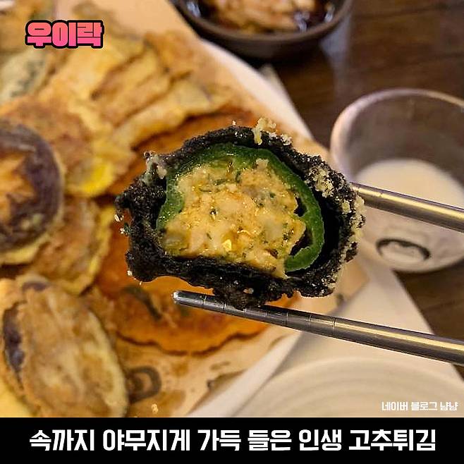 우이락은 고추튀김이 맛있는 막걸리집이라는 컨셉을 가지고 있지만 사실(!!!) 우이락은 전 맛집이라는 거 알고 계셨나요? 모둠전과 해물파전을 주문과 동시에 만들어 따끈따끈한 전들을 만나볼 수 있다구요.