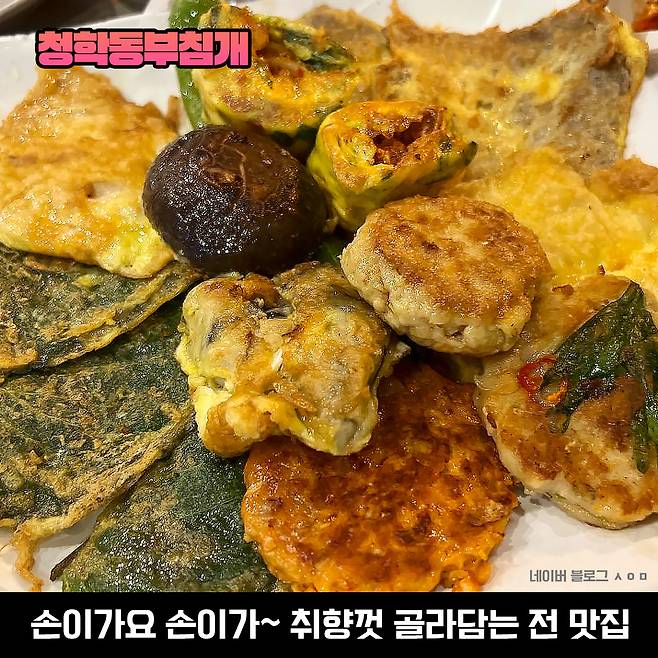 청학동부침개 마포 본점은 20여가지의 다양한 전들을 골라 담아 먹는 전집입니다. 호박전, 표고버섯전, 산적, 고추전, 동태전, 동그랑땡 등 일종의 전 뷔페라고 할까요?
