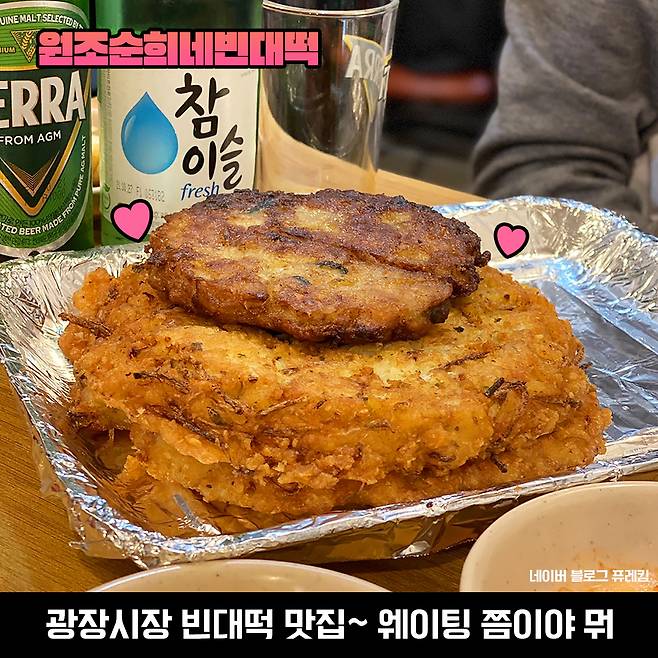 매장에 가면 빈대떡을 쌓아 놓고 만드시는 이모님들의 모습도 볼 수 있어요. 줄을 기다리며 노릇하게 부쳐지는 전을 보고 있으면 기나긴 웨이팅 줄도 금방이라는 거. 이곳의 대표 메뉴는 빈대떡과 녹두전, 그리고 고기 완자 되시겠슴다!