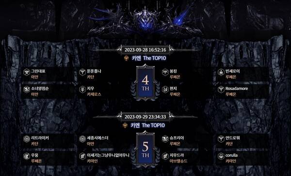카멘 The TOP10(4TH) 그린대표(잔재된 기운 블레이드), 뚠뚠홀나(홀리나이트), 봉킹(두 번째 동료 호크아이), 빈세로이(광기 버서커), 소니양점순(고독한 기사 워로드), 지우(포식자 슬레이어), 편지(절정 창술사), Rosadamore(홀리나이트)
