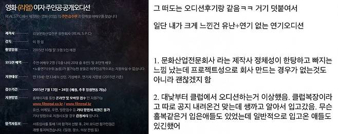 지난 28일 한 온라인 커뮤니티에는 '영화 '리얼' 여자주인공 공개 오디션 후기'라는 제목의 글이 올라왔습니다.