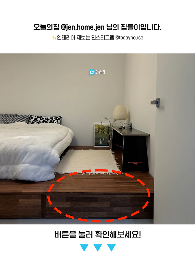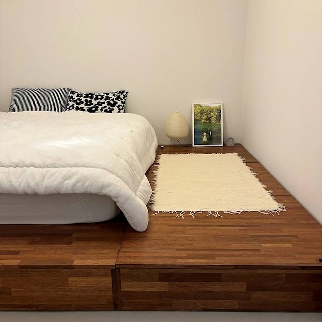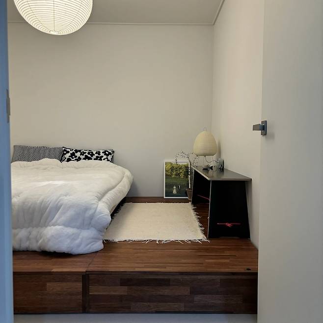 침대 옆 오른쪽 공간은 세 개의 하단 수납장으로 사용할 수 있도록 직접 디자인했어요. 러그나 스툴, 벤치를 두기에도 충분한 공간이라 앞으로도 다양한 인테리어를 시도해 볼 수 있을 것 같아요.