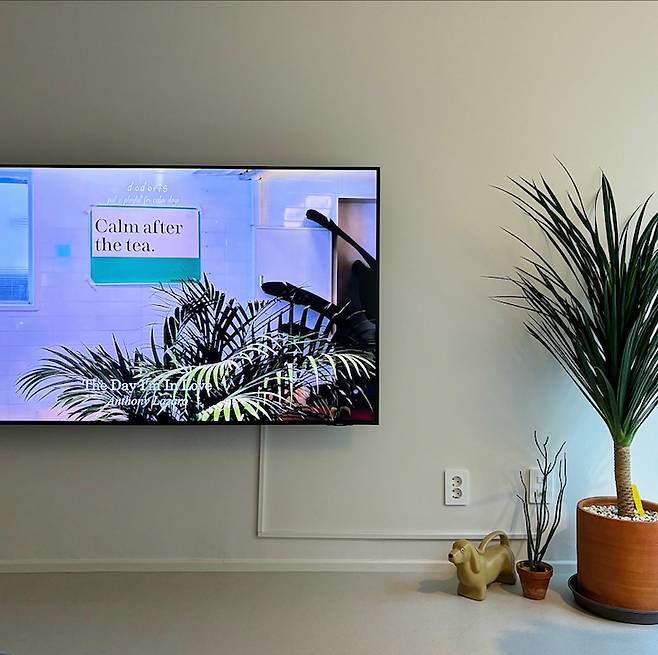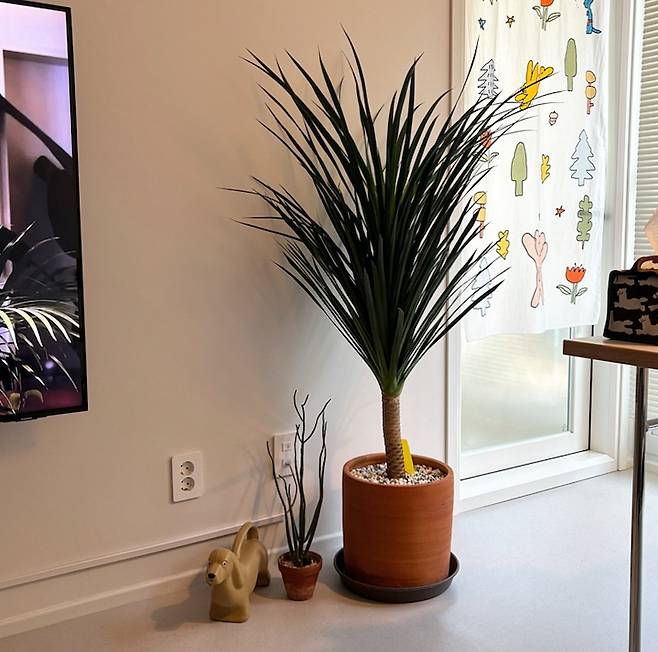 TV 옆에는 제 인생 첫 대형 화분인 드라세나 드라코 친구가 있는데요! 시부모님께서 집들이 선물로 사주셔서 무척 애정이 가는 친구입니다 :) 대형 식물들을 많이 키우고 싶었는데, 그 시작이 되어준 친구랍니다!