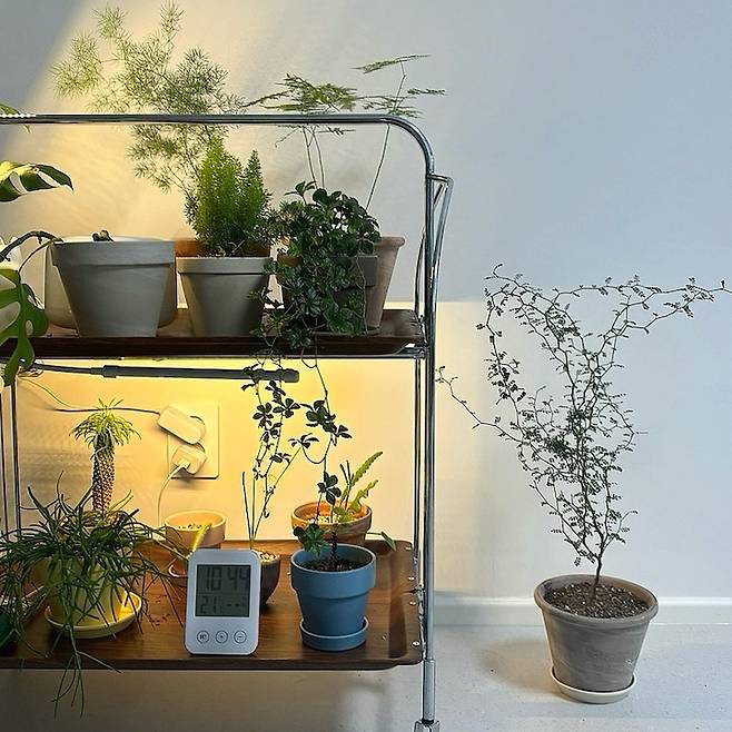 한 번 보고 바로 꽂혀버린 우드 트롤리에 오밀조밀 모아둔 식물들! 따뜻한 식물등 빛까지 합쳐져 제가 자주 들여다보고 애정 하는 공간이랍니다.