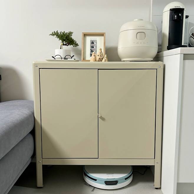 동글동글 귀여운 밥솥은 꺼내두고 전자레인지와 에어프라이어는 안에 넣어 수납하고 있답니다! 가장 하단에는 로봇청소기까지 쏘옥 들어가는 구조라 아주 딱이에요.