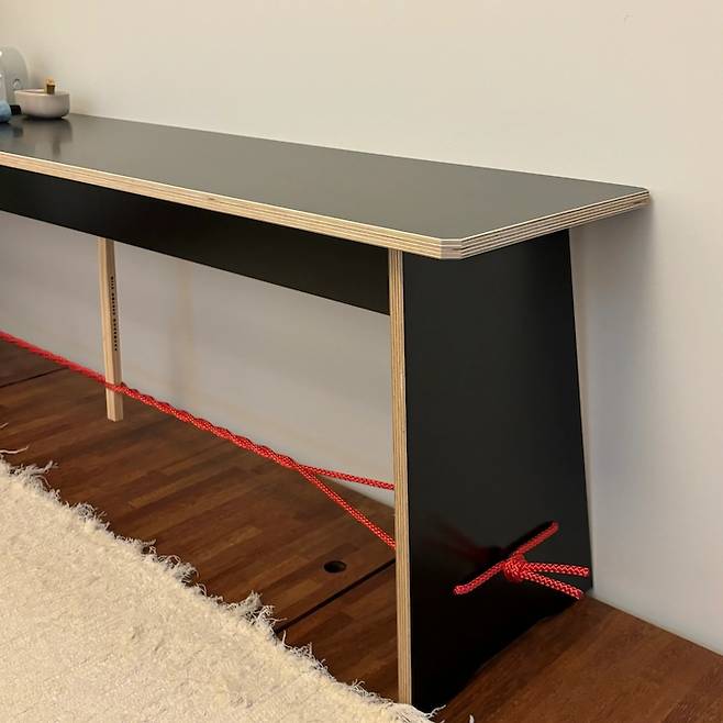 침실에 들일 벤치는 아주 오랜 시간 고민하다 고른 제품인데, 무어만 랑거 막스라는 친구예요. 모던한 블랙 컬러에 빨간색 로프 포인트가 확 꽂혀서 바로 구매했답니다!