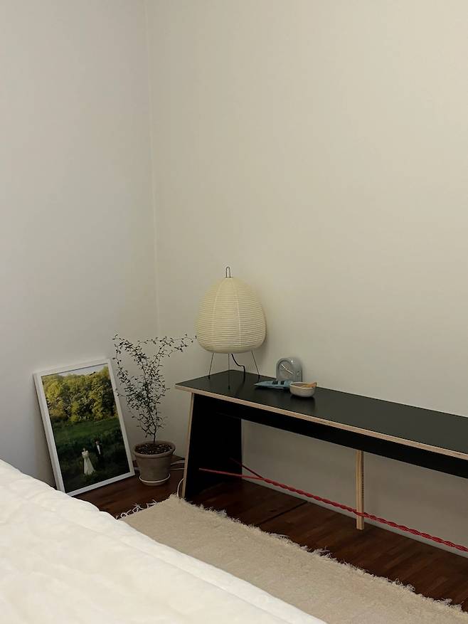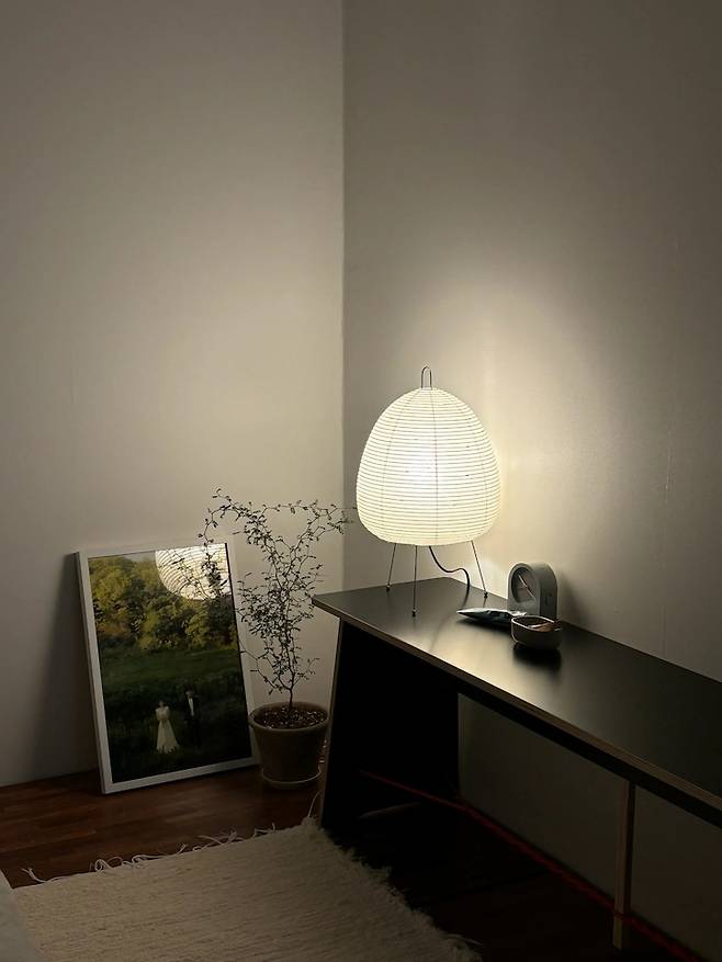 무어만 랑거 막스 벤치 위에 앉은뱅이 조명도 아카리 조명인데 침실의 포인트 조명으로 활약하고 있어요. 켜져 있을 때나 껐을 때에도 둘 다 너무 예쁘답니다!