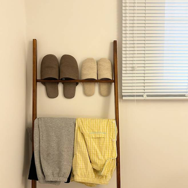 침대 아래켠에는 사다리 행거를 두었는데요! 잠옷들을 편하게 툭툭 걸어놓을 수 있어 편하기도 하고, 길이가 있어 한 쪽 벽에 인테리어 효과까지 줄 수 있어 좋은 것 같아요!