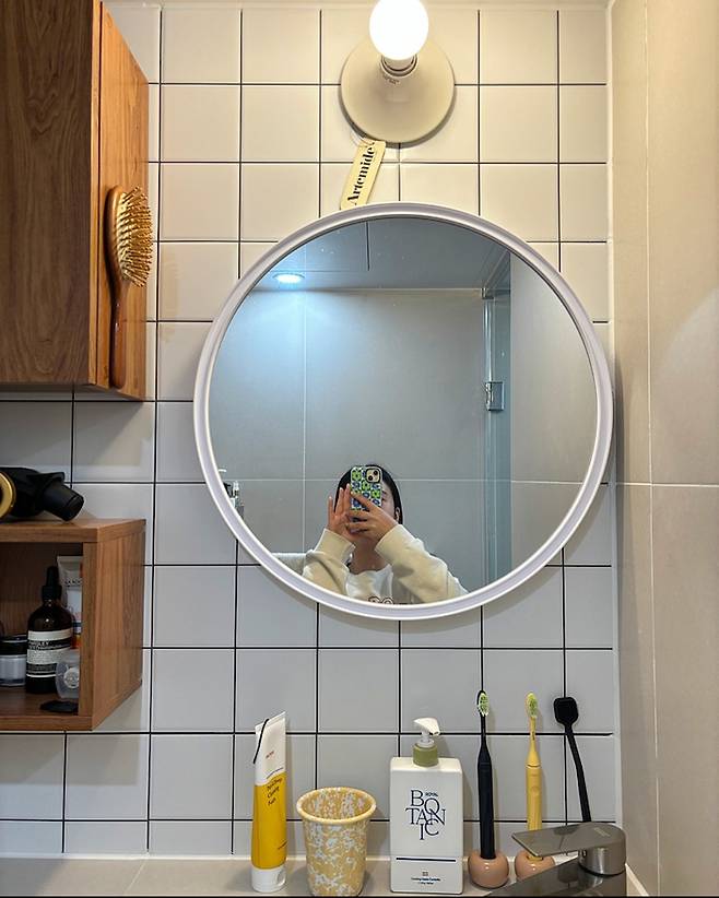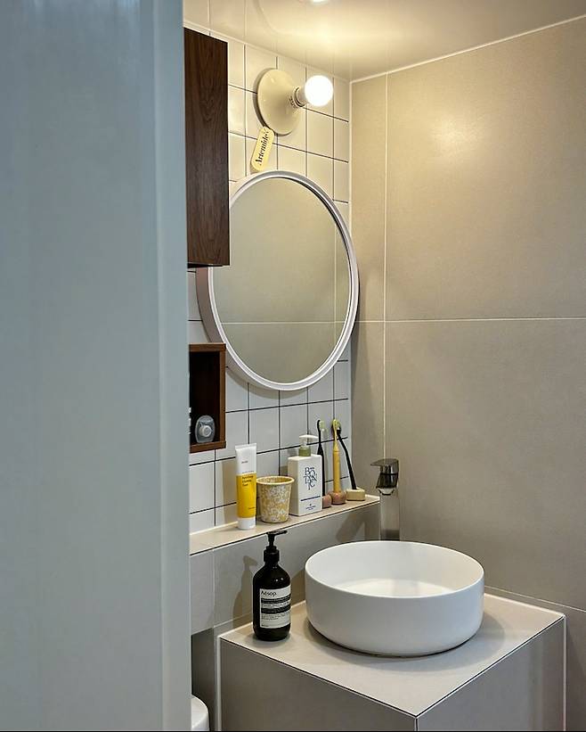 화장실에 꼭 달고 싶었던 아르떼미데 테티 조명! 벽변 잔 타일들과 귀엽게 잘 어울려서 마음에 들어요. 물이 튈 일 없으니 아르떼미데 택도 그대로 살렸답니다.
