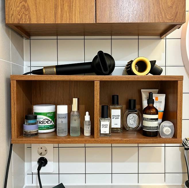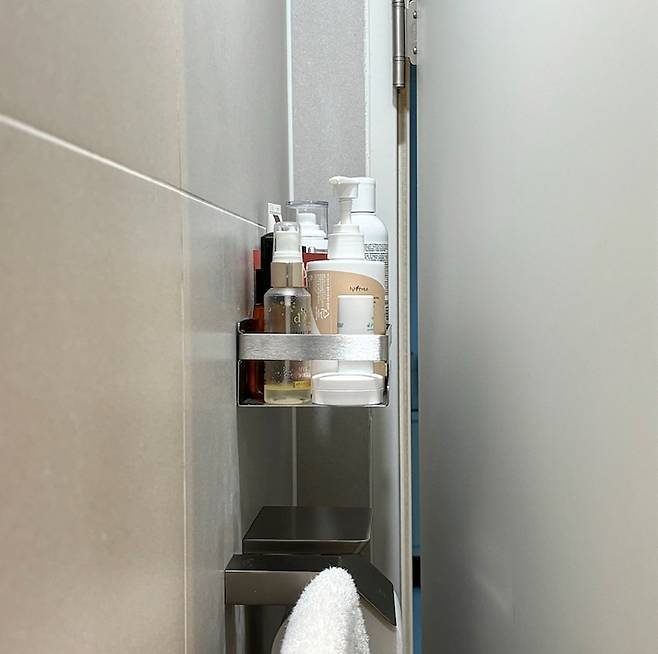 기초 제품이나 화장품이 많은데, 수납장과 선반으로는 감당이 안 돼서 무타공 선반을 따로 사서 걸어주었어요! 무타공인데도 아주 견고하게 붙어서 화장품들을 엄청 많이 올릴 수 있고, 문을 열면 이렇게 문 뒤에 숨는 위치라 깔끔하게 수납도 가능하답니다!