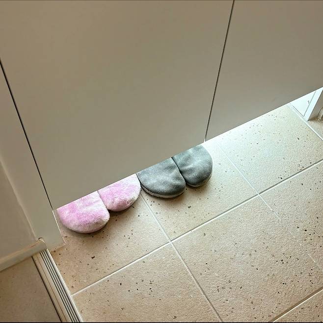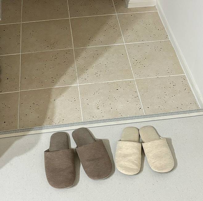 현관 타일은 남편이 원했던 테라조 타일로 했어요! 사실 이 타일은 바닥재 전용 타일이 아니고 벽에 붙이는 타일용이라 타일 사장님께서 말리셨었는데 부드러운 샌드 컬러와 자잘한 테라조 패턴을 포기할 수가 없어서 우기고 졸랐어요. ꌩ-ꌩ 밝은 컬러라 때 잘 탈까 봐 걱정했는데, 먼지들이 패턴에 숨어 청소 방어가 꽤 되는 친구였습니다. (흡족)