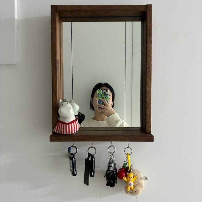 원목 거울 밑에는 다이소 흡착식 고리들을 사서 달아주었어요! (나름의 DIY 호호) 외출할 때 필요한 소지품들을 걸어두니 까먹을 일도 없고 귀여운 키 링들과 작은 소품으로 꾸미면 분위기 전환에도 좋아 저희 집의 작은 포토존이 되었답니다!