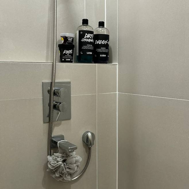 샤워 수전들은 매립공사로 진행했는데요! 스위치와 샤워 호스만 나와 있는 형태라 공간이 훨씬 깔끔해 보이고, 젠다이도 만들어 샴푸, 바디워시 등을 올려두고 편히 사용 가능하답니다 :)