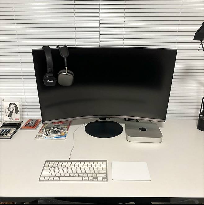 테이블이 블랙&화이트 톤에 스틸 포인트라 의자, 모니터, 키보드랑 잘 어울리죠?