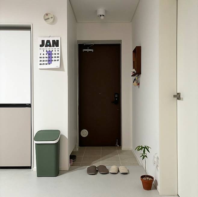 전신거울을 달까 말까 고민 많았던 현관, 결국 작은 원목 거울을 달았는데요! 현관이 넓은 편은 아니라 오히려 콤팩트하게 공간을 활용하는 것 같아 만족하고 있어요.