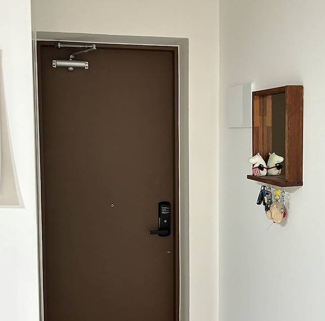현관문은 필름 작업으로 진행했는데 베이지톤 타일과 잘 어울리는 컬러는 브라운이 딱이라고 생각했어요! 차분하고 딥한 브라운 톤이라 원목 거울과 통일감이 느껴지고 도어스토퍼를 사용하면서 나는 신발자국들도 티가 많이 안 나서 좋은 것 같아요.