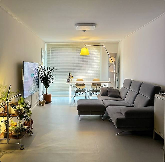 거실 현관에 들어서면 주방, 거실이 순서대로 한눈에 보이는데요! 거실은 저희 부부가 가장 많이 머물러 있는 메인 공간이라 먼저 소개할게요! 베란다(발코니)를 확장해 일자로 긴 거실이 완성되었답니다~