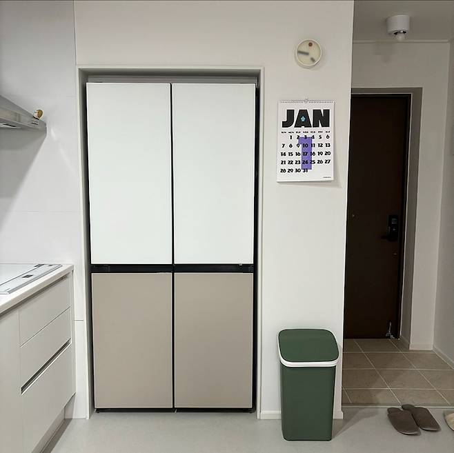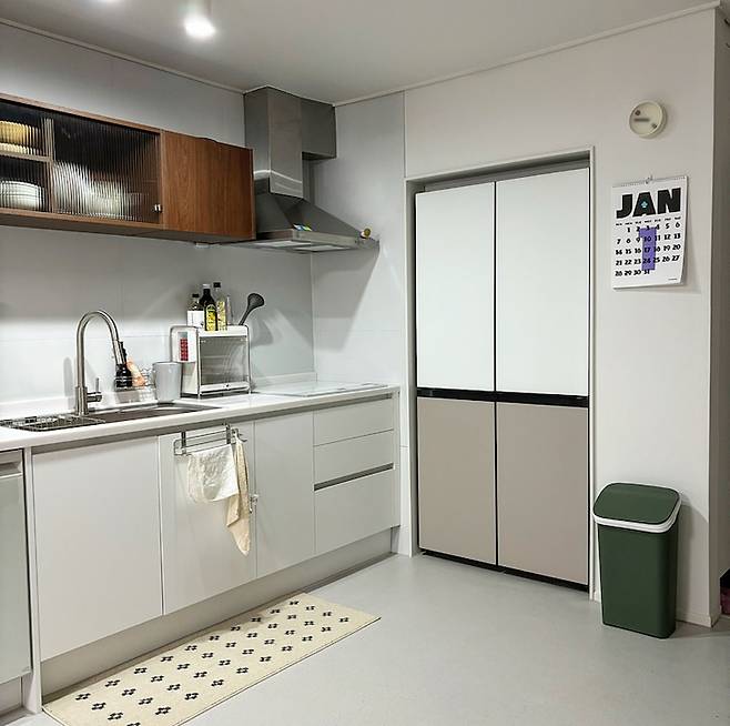 냉장고가 있는 이곳은 사실 세탁실로 사용되던 공간이었는데, 목공 장을 짜서 빌트인 냉장고처럼 깔끔하게 넣어주었어요. 삼성 비스포크 제품이라 컬러나 디자인을 직접 고를 수 있어 우드 상부장과 잘 어울릴 수 있는 컬러로 골라주었답니다!