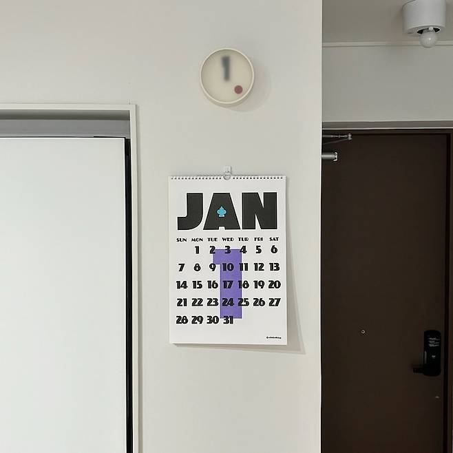 냉장고 옆엔 작은 여백이 있어서 시계와 달력을 걸어주었어요. 렘노스 케하이 벽시계인데 빨간 동그라미 초침이 포인트로 너무 귀엽지 않나요? 달력도 리소 프린팅으로 컬러감이 돋보여서 확 튀는 공간이 된 것 같아요!