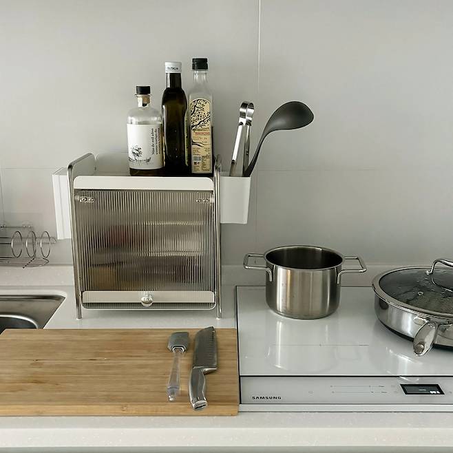 스테인리스 주방용품들이 많다 보니 얼마 전 양념장 선반도 비슷한 무드의 제품으로 들였습니다. 손잡이를 위로 드는 플립 도어 형식이고, 예쁘기도 예쁜데 앞판을 위로 올려 고정도 가능해서 실용성도 아주 좋은 제품이에요.