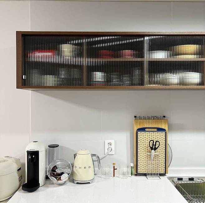 안쪽이 불투명하게 비쳐서 더 예쁜 분위기를 내는 것 같아요. 상부장 아래 공간은 저희의 홈카페처럼 사용하고 있답니다!