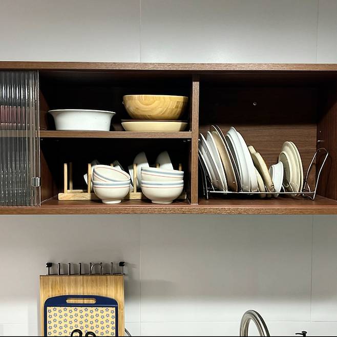 상부장의 반쪽은 컵, 다른 반쪽은 그릇들을 수납하고 있어요. 칸막이를 넣었다 뺐다 할 수 있는 구조라 1단, 2단 원하는 구조로 바꿔가며 사용할 수 있어 좋은 것 같아요. ( ◜‿◝ )*.✧