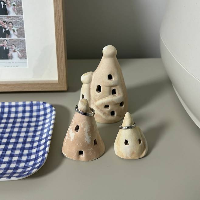 이 작은 오브제들은 신혼여행으로 다녀왔던 터키 카파도키아라는 곳에서 데려왔는데 결혼반지 거치대로 딱이라 요렇게 걸어두고 있어요 ദ്ദിᐢ. .ᐢ₎