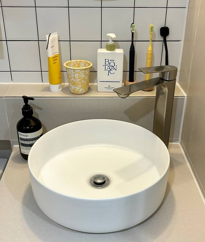 세면대 앞쪽에 젠다이를 만들어 폼 클렌저, 치약 칫솔 등 올려두고 편히 사용하고 있어요!