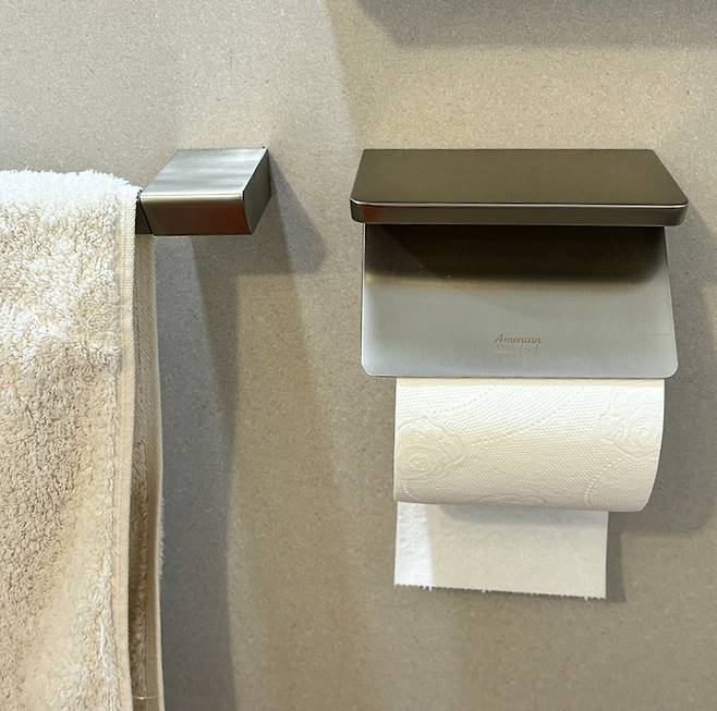 화장실 변기, 수전, 샤워기, 수건걸이, 휴지걸이까지 모두 아메리칸 스탠더드 제품인데요. 무광 재질이 고급스럽고 정말 튼튼해서 아주 만족 중입니다!