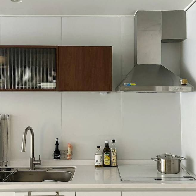 다음은 거실과 일자로 이어져 있는 주방입니다. 주방은 화이트톤으로 깔끔하면서도 우드 상부장과 스테인리스 침니 후드로 포인트를 주었어요! 우드와 스테인리스의 조합이 여기서도 빛을 발해 무척 마음에 듭니다 :)