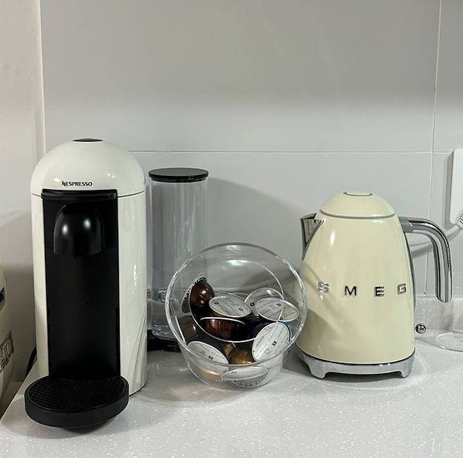 커피 머신은 네스프레소 버츄오플러스를 사용 중인데, 캡슐도 다양하고 크레마가 빵빵해 정말 완벽한 홈카페를 즐길 수 있어요. 커피 머신 고민하시는 분들께 강력 추천드려요! 전기포트는 스메그 제품인데 귀엽고 성능까지 좋은 친구라 만족하며 사용 중입니다.