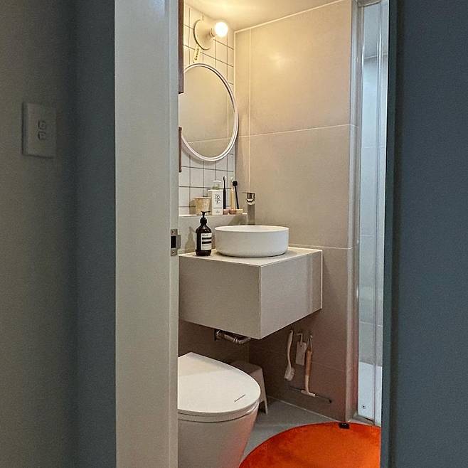 건식 부분에는 러그를 깔아 맨발로 다니고, 샤워하고 나와서도 물기를 바로 흡수해 주니 이만큼 편한 게 없더라고요. 러그를 바꿔줄 때마다 무드가 확 변해서 다양하게 꾸밀 수도 있을 것 같아요!