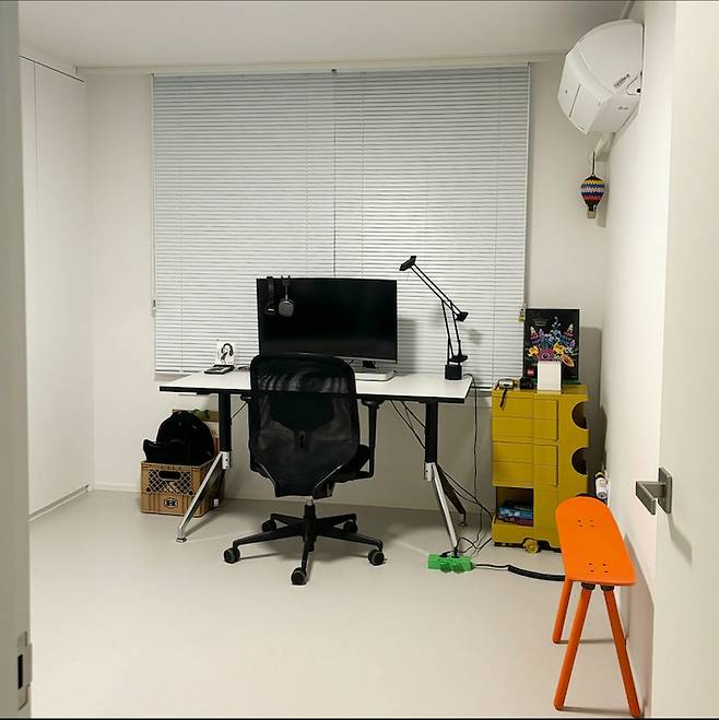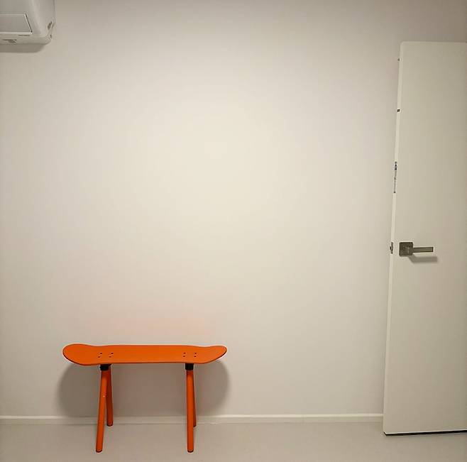 데스크 오른쪽 큰 벽에는 선반을 달 예정이에요, 어떤 선반이 좋을지 원하는 디자인을 아직 고르지 못해서 차일피일 미뤄지고 있어요(ㅜ). 쨍한 주황색 컬러의 스툴은 워터 탱크 베이스먼트의 스케이트 스툴인데, 컬러와 귀여운 쉐입에 반해 당근해 왔어요! 어디든 두고 식물들을 올려놓으면 너무 예쁠 것 같아요!