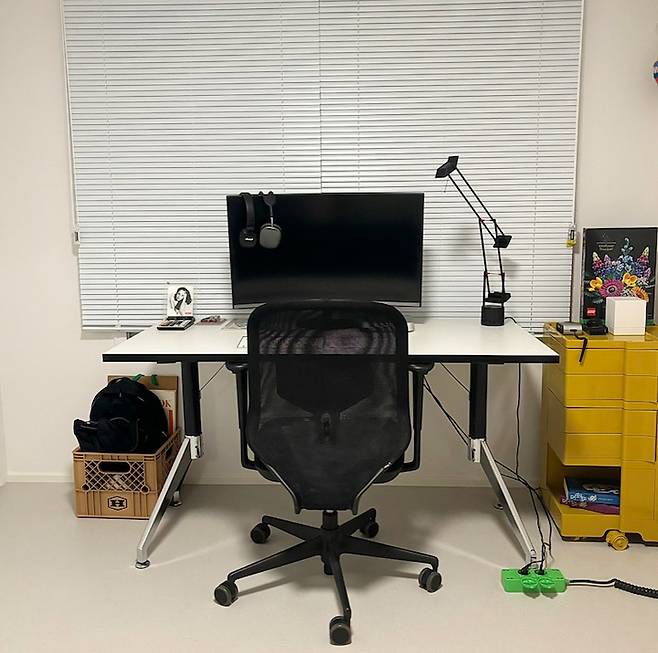 저희가 집에서 업무를 볼 때 사용하는 데스크입니다. 의자는 비트라 ID 매쉬 체어인데, 다양한 옵션으로 커스터마이징이 가능한 의자라고 해요!