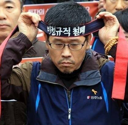 - 제1차 민중총궐기 집회로 조계사에 피신했다가 나올 때 비정규직 머리띠를 맨 장면이 유명하다. 왜 그랬는가.