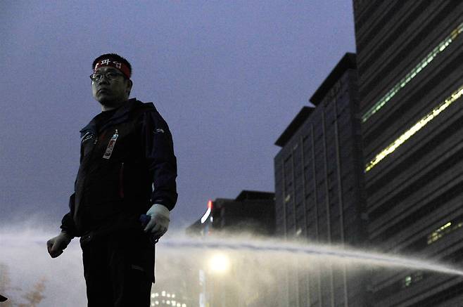 | ▲ 민중총궐기 2015년 11월 14일 제1차 민중총궐기 당시 물대포가 쏜 물줄기가 한상균 민주노총 위원장 옆을 지나가고 있다. |
