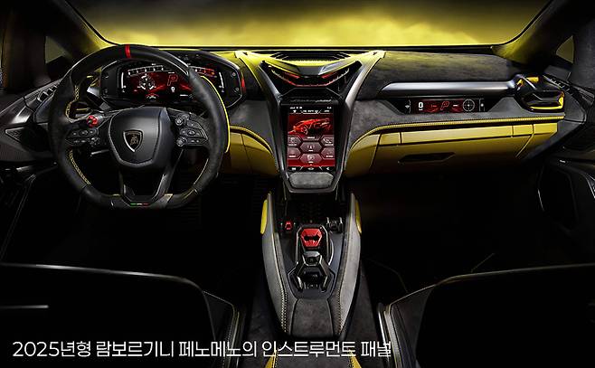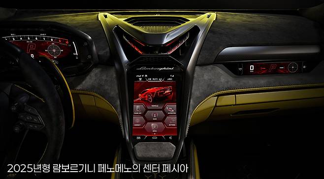 새로운 람보르기니 페노메노 역시 운전석과 동승석 인스트루먼트 패널에 모두 디스플레이가 적용돼 있고, 커다란 센터 페시아 디스플레이 패널은 육각형 그래픽과 빨간색 조명으로 그야말로 그 속에 용광로가 들어 있어서 고출력 파워가 펄펄 끓고 있는 느낌입니다. 마치 터치 스크린에 손을 대면 뜨거운 열기에 화상을 입을 것 같기도 합니다.