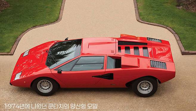 그리고 3년 뒤인 1971년에 역시 마르첼로 간디니의 디자인으로 등장한 쿤타치는 미우라와 완전히 대비되는 기하학적 조형에 마치 가위처럼 움직여 열려서 시저 도어(scissors door)라고 불리는 도어에 극도의 간결한 조형으로 당시의 젊은이들의 가슴에 불을 당겨서 ‘포스터 슈퍼카’의 시초가 됐습니다.