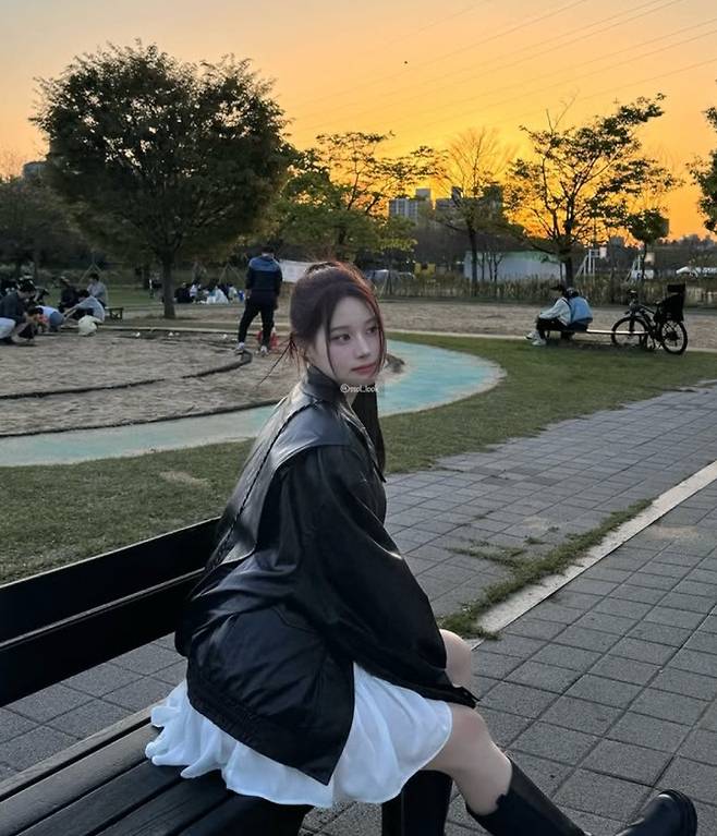 마지막으로 내가 제일 좋아하는 스타일! 😎 화이트 미니 원피스에 시크한 가죽 자켓, 롱부츠 조합이라니…! 🖤 완전 힙하면서도 여성스러운 느낌 동시에 낼 수 있는 코디잖아! 머리까지 묶어주니 더 어려 보이는 효과까지! 역시 패피는 다르다니까?