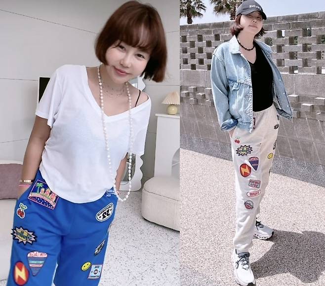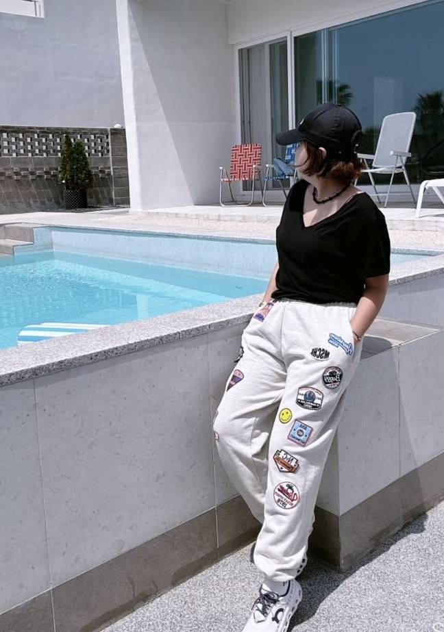 황혜영은 기본적인 티셔츠와 조거 팬츠를 활용해 편안하면서도 감각적인 스타일을 완성했습니다.