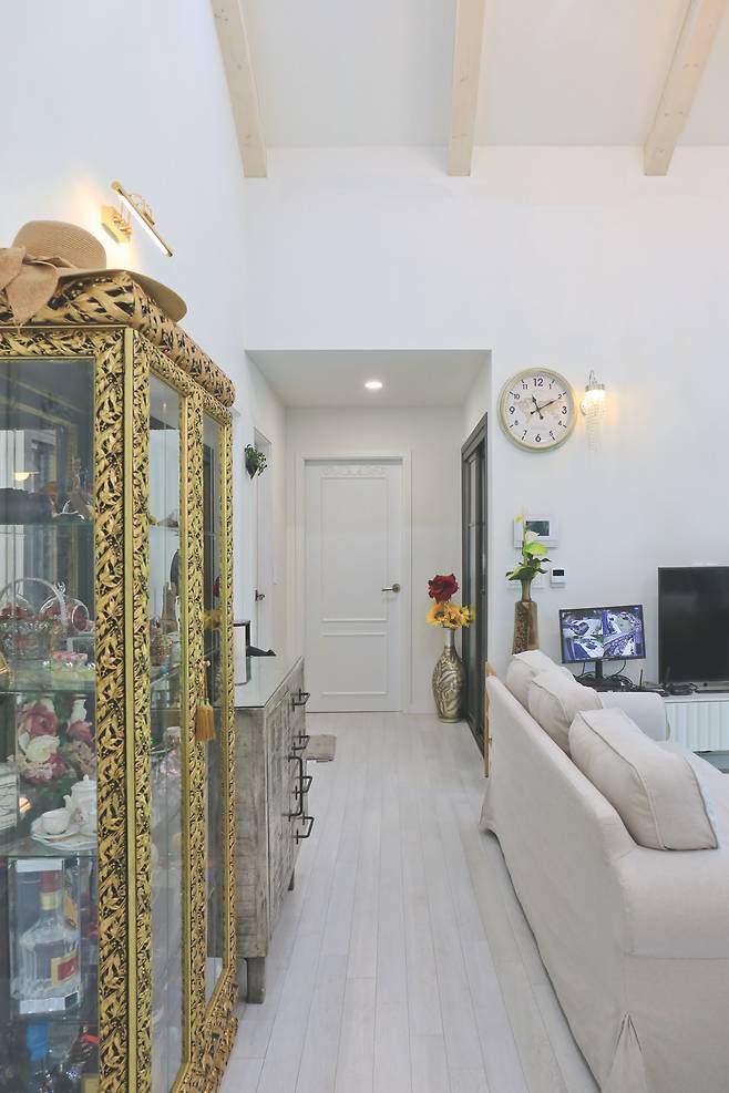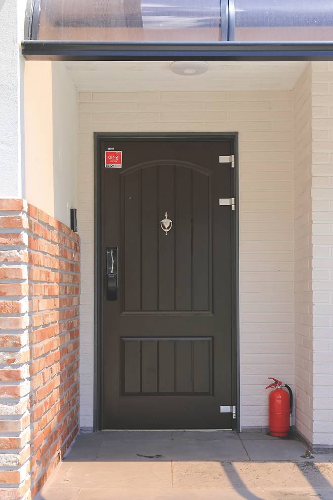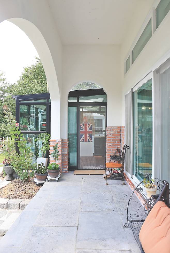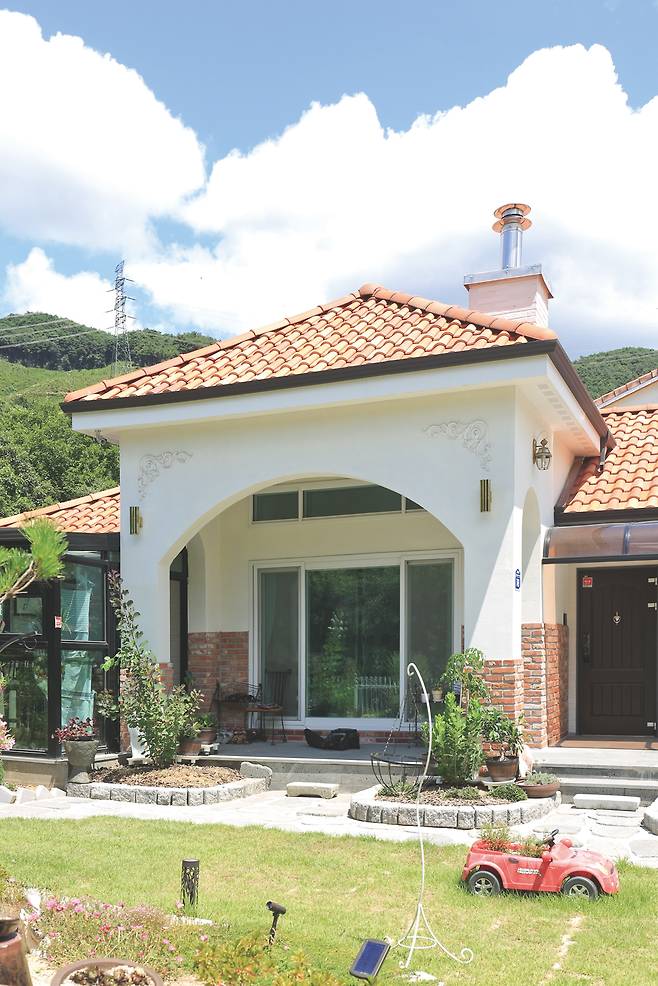 외부에서 현관으로 들어서면 흰색 스타코로 마감한 벽체와 붉은색 기와를 사용한 지붕이 이목을 끈다. 모임형태로 디자인된 지붕이 유럽 어느 휴양지와 같은 프로방스풍 분위기를 자아내며 더운 여름날 시원한 인상을 전한다.