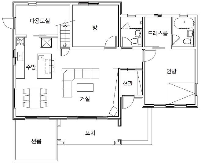 내부 또한 정원과 풍광을 고려한 배치 계획에 맞춰 실이 구성됐다. 현관은 남쪽에 배치해 정원과 외부로의 진출입을 용이하게 풀었고 이를 기준으로 왼쪽에 거실과 주방을, 오른쪽에 침실을 두어 기본적으로 갖춰야 할 쾌적한 생활 및 숙면 환경을 둘 다 만족시켰다. 여기에 다용도실과 썬룸과 같은 보조공간을 주방과 식당에 인접하도록 계획해 적재적소에 여가 및 수납 동선도 구축했다.