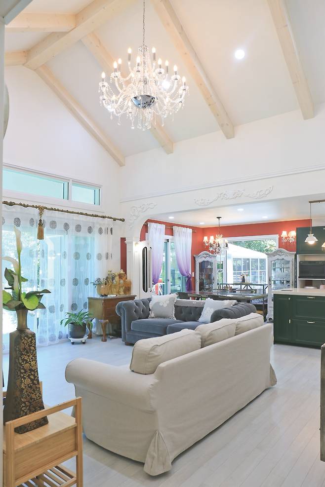 주택의 중심인 거실에서는 현관에 들어와 바로 마주하는 높은 천장이 개방감을 선사한다. 압도감으로 시작된 분위기는 서서히 눈에 들어오는 노출된 목구조와 샹들리에를 통해 아늑함으로 전해진다. 그 뒤에는 식당과 주방이 배치됐다. 거실과 사이에 벽을 계획하지 않아 시야가 트였으며 이는 자칫 협소한 면적에서 발생할 공간의 답답함을 덜어준다.