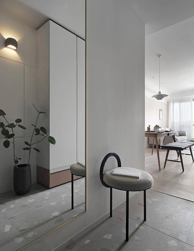 문을 열고 들어서는 순간, 천장까지 닿는 대형 거울이 시선을 사로잡는다. 비좁고 평범한 현관의 이미지를 뒤엎는 이 거울은 외출 전 마무리를 위한 기능은 물론, 공간감을 확장하는 시각적 장치로 자리 잡았다.