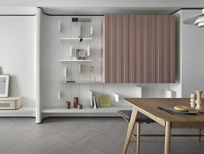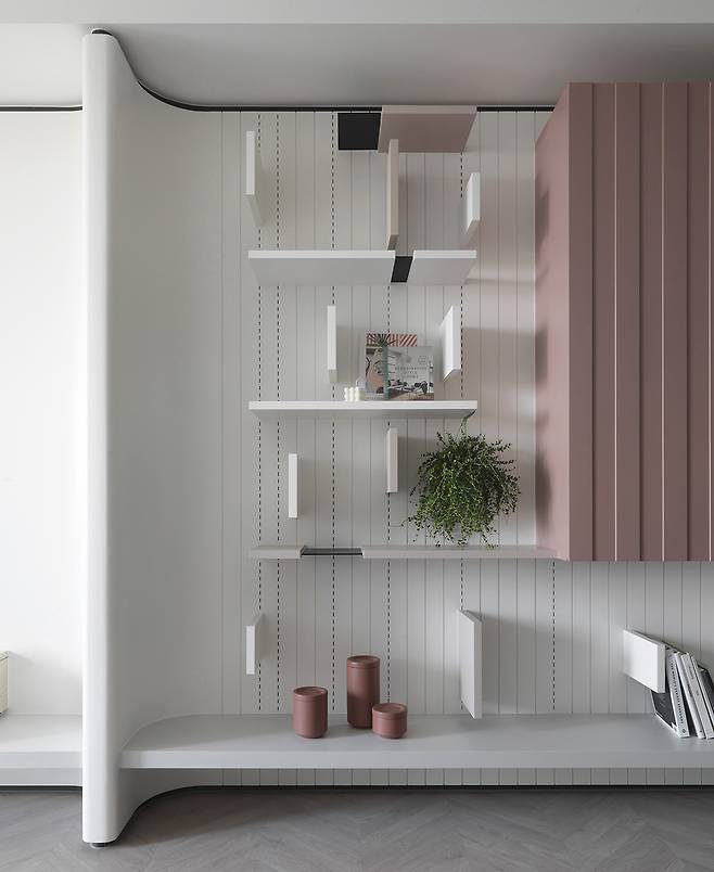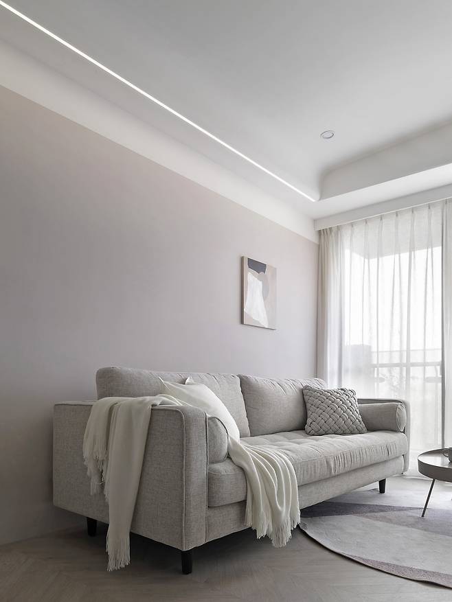 북유럽풍 디자인의 정수를 담아낸 거실은 불필요한 선과 색을 철저히 덜어낸 공간이다. 날카로운 모서리를 없애기 위한 곡선 캐비닛과 벽면은 부드럽고 아늑한 분위기를 연출하며, 핑크에 가까운 회색조 컬러는 모란디 특유의 우아함을 강조한다.