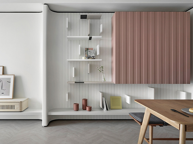 집주인의 손으로 만든 섬세한 꽃 예술 작품은 다이닝룸의 한쪽 벽을 전시장처럼 바꿔 놓았다. 부드러운 곡선의 윤곽을 따라 흐르는 선반과 장식장은 시각적으로 리듬을 주며, 실용성과 장식성을 모두 갖췄다.