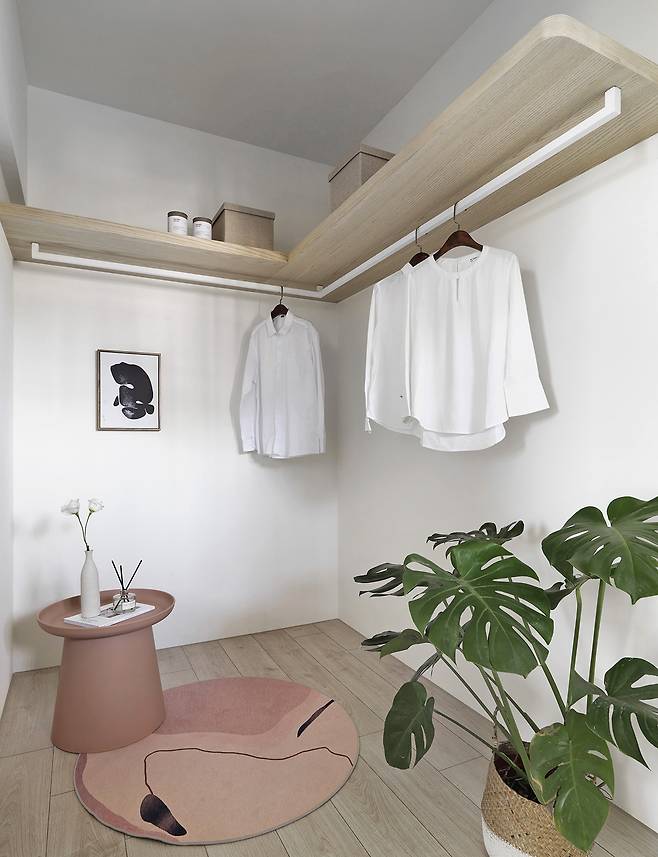 드레스룸은 과감하게 캐비닛을 생략하고, 오픈형 선반과 옷걸이만을 배치해 공간감을 극대화했다. 폐쇄적인 수납 대신 집주인의 생활 습관에 맞춘 유연한 구조와 동선 설계가 돋보인다.