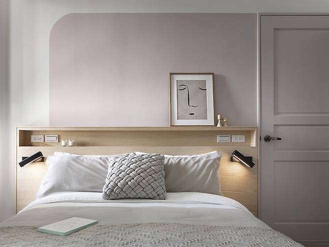 침실로 들어가면, 거실과 통일감을 이루는 부드러운 곡선 벽체와 톤 다운된 컬러가 자연스럽게 시선을 감싼다. 조절 가능한 양쪽 조명은 독서와 취침을 모두 아우르며, 기능성 슬라이딩 도어가 침실과 드레스룸을 부드럽게 연결한다.