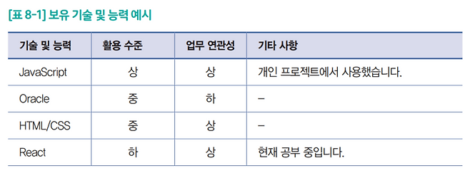 예를 들어, 지원하려는 회사의 직무는 프론트엔드라고 해 봅시다. 이때 자바스크립트 기술은 프론트엔드 직무와 연관성과 높기 때문에 ‘상’으로 표현합니다. 기타 사항에는 해당 기술과 관련한 추가적인 코멘트를 적습니다. 기술에 대해 배운 지 얼마되지 않아 활용 수준이 낮을 경우 ‘현재 공부 중’이라고 적을 수도 있습니다.
