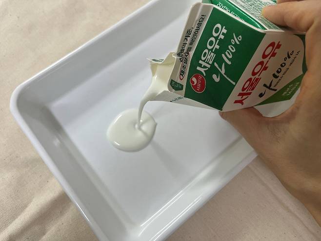 만일 전체적으로 고르게 우유에 담그고 싶다면 넓은 그릇을 활용하세요. 넓은 용기에 우유를 넉넉히 붓습니다.